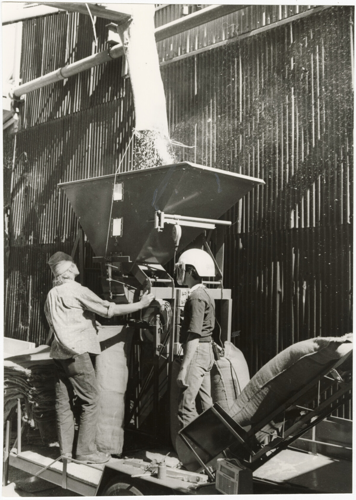 Gary Bleeker (left) and Carl Wakefield using a portable bagging machine at Grain Elevators Limited plant, Addington.