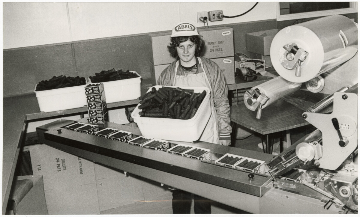 Lynette Brinfield, a Yardleys Bakery employee, loading the brandy snaps wrapping machine at the factory at 108 Shortland Street in Aranui.