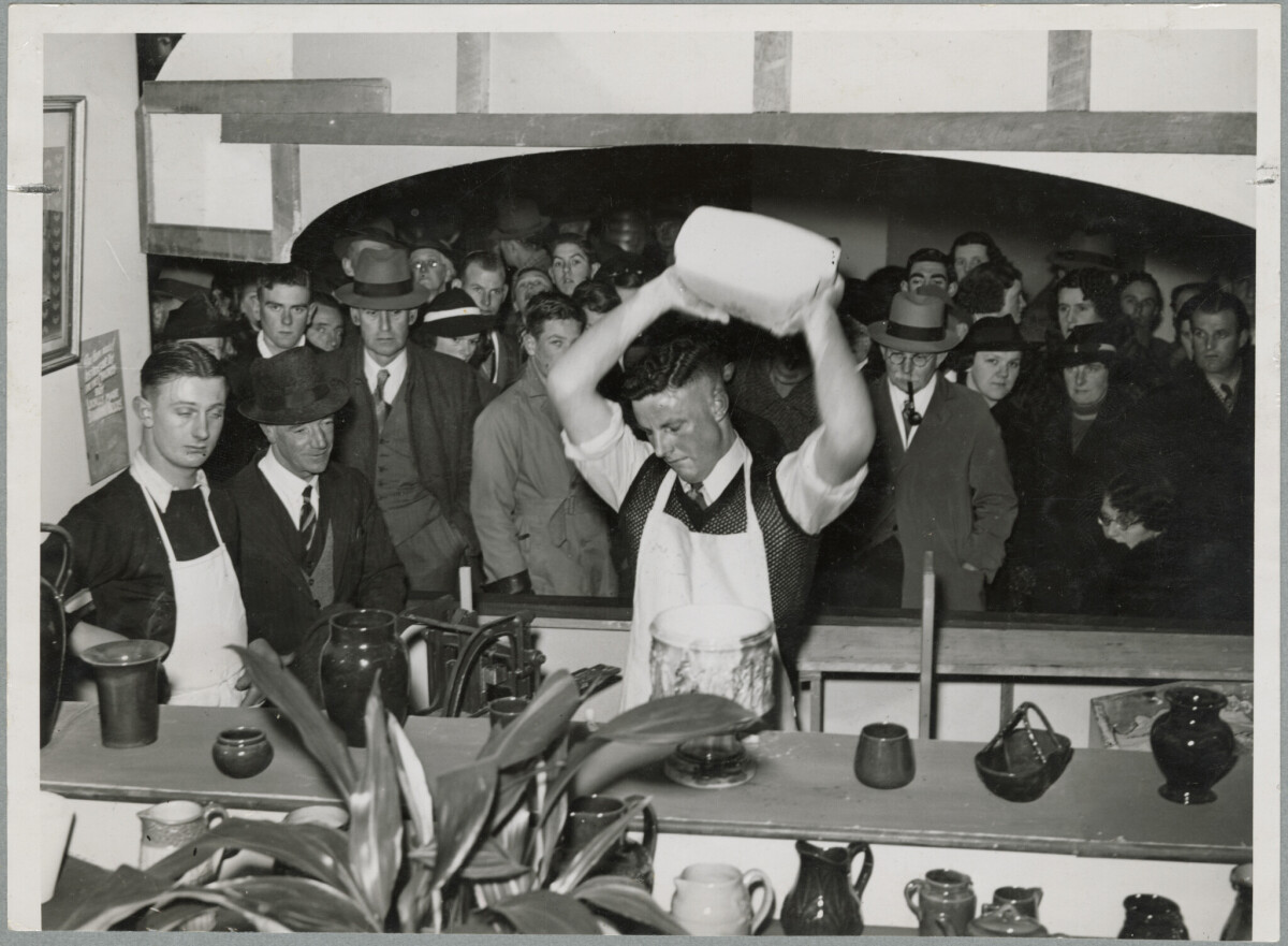 A crowd watches a potter at work at the New Zealand Industries Fair held at the Dalgety's buildings in October 1941.
