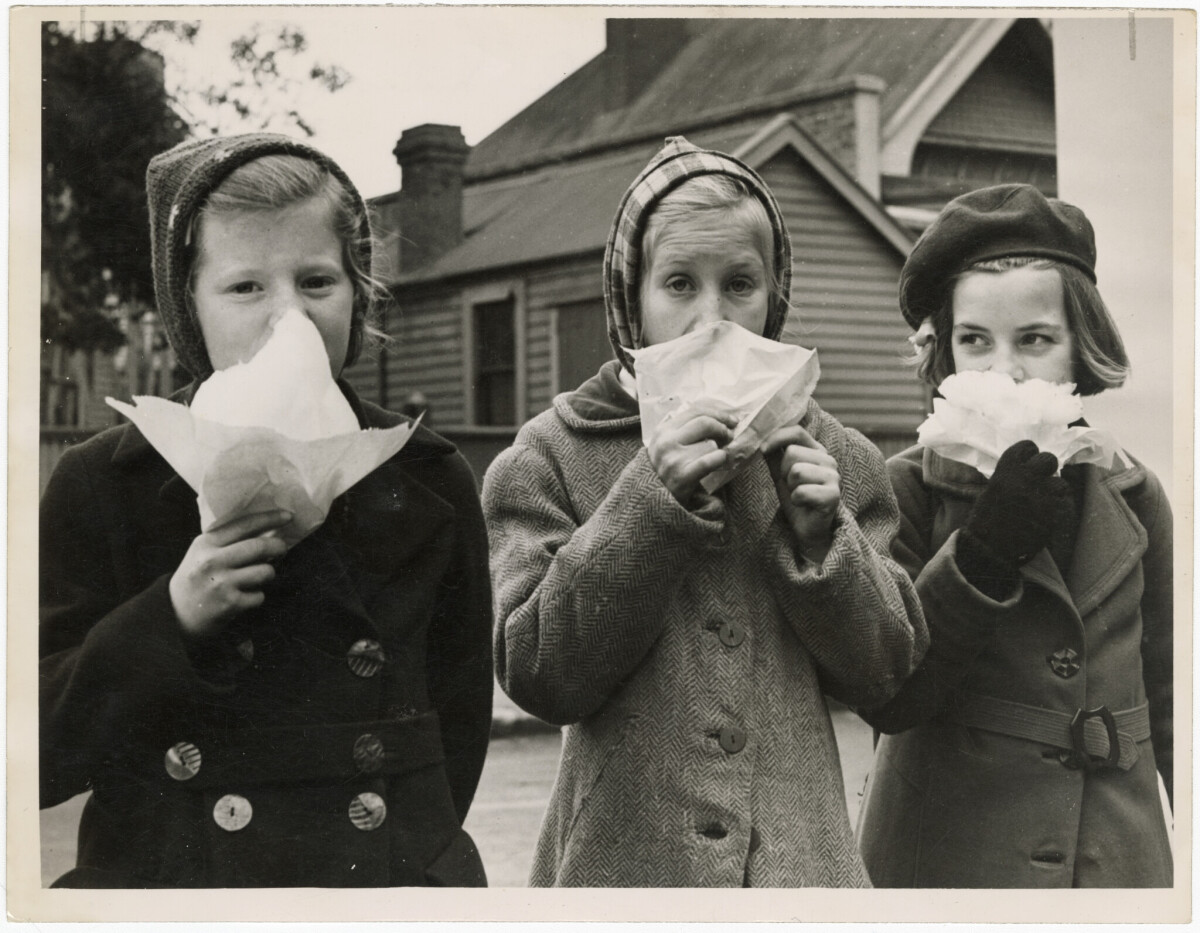 Children eating candy floss at the Industries Fair at the Addington Show Grounds.