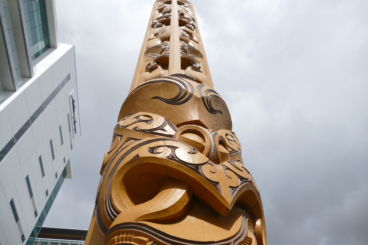 Te Pou Herenga Waka pouwhenua outside Te Hononga Christchurch City Council Civic Buildings on the Worcester Street entrance.