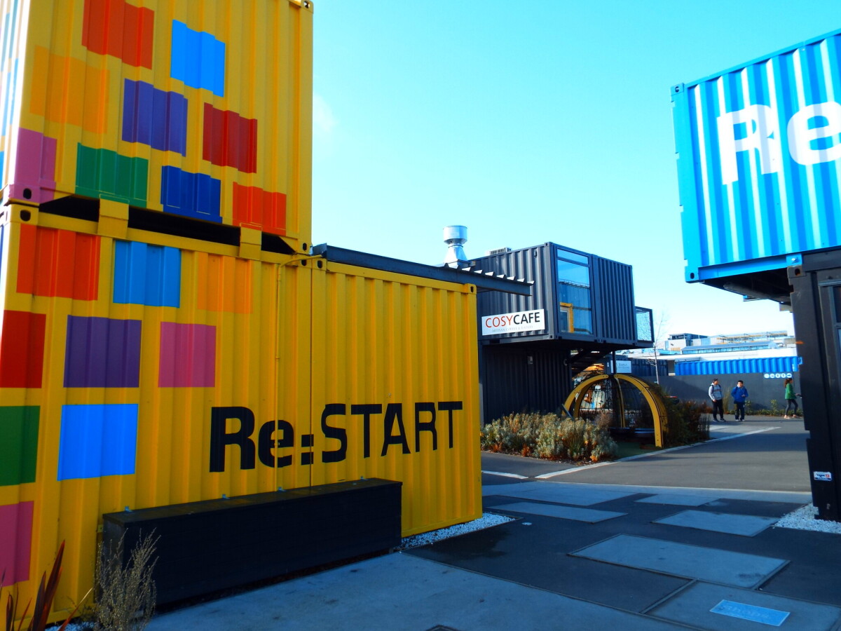 Painted containers marking the entrance to Re:START mall on the corner of Cashel Street and Oxford Terrace.