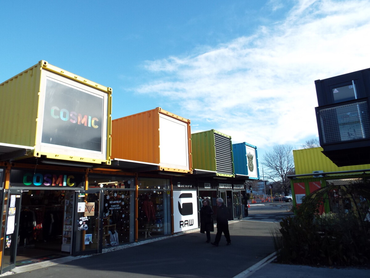 View of shops in the Re:START shopping mall on the corner of Cashel Street and Oxford Terrace.