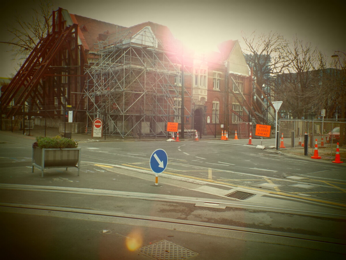 View of the Municipal Chambers building with scaffolding and of road closure signs along Oxford Terrace, at the intersection with Worcester Street.