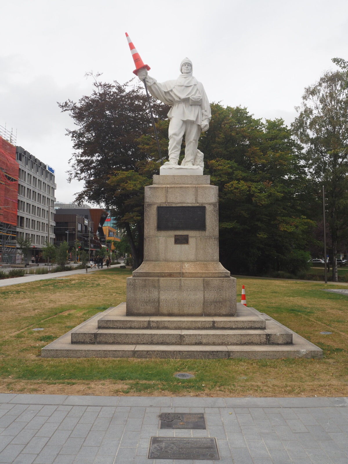 Robert Falcon Scott statue with the addition of a cone.