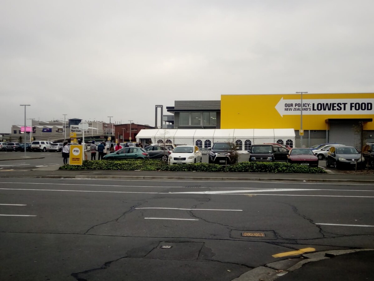 Trip to Pak'n'Save Moorhouse on the morning of Day 9 of the Co-vid19 lockdown. The queue started on the Manchester Street footpath, wound it's way through the tent to the entrance where a security guard let one person in as another left.