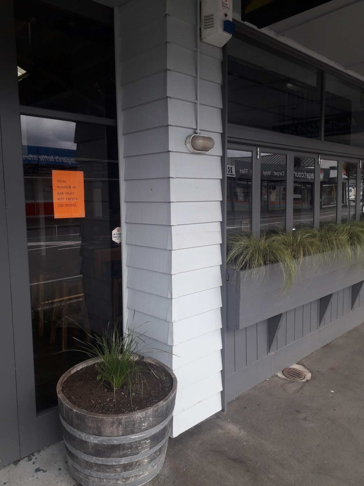 Notice in window of Main Street Sports Bar on High Street, Rangiora, stating that no more than 100 people are permitted in the bar at a time due to Covid-19. Construction site next to bar is new flats being built on corner of High Street and Ivory Street, where the Red Lion used to be. By the time this image was taken, this notice was a few days out of date.