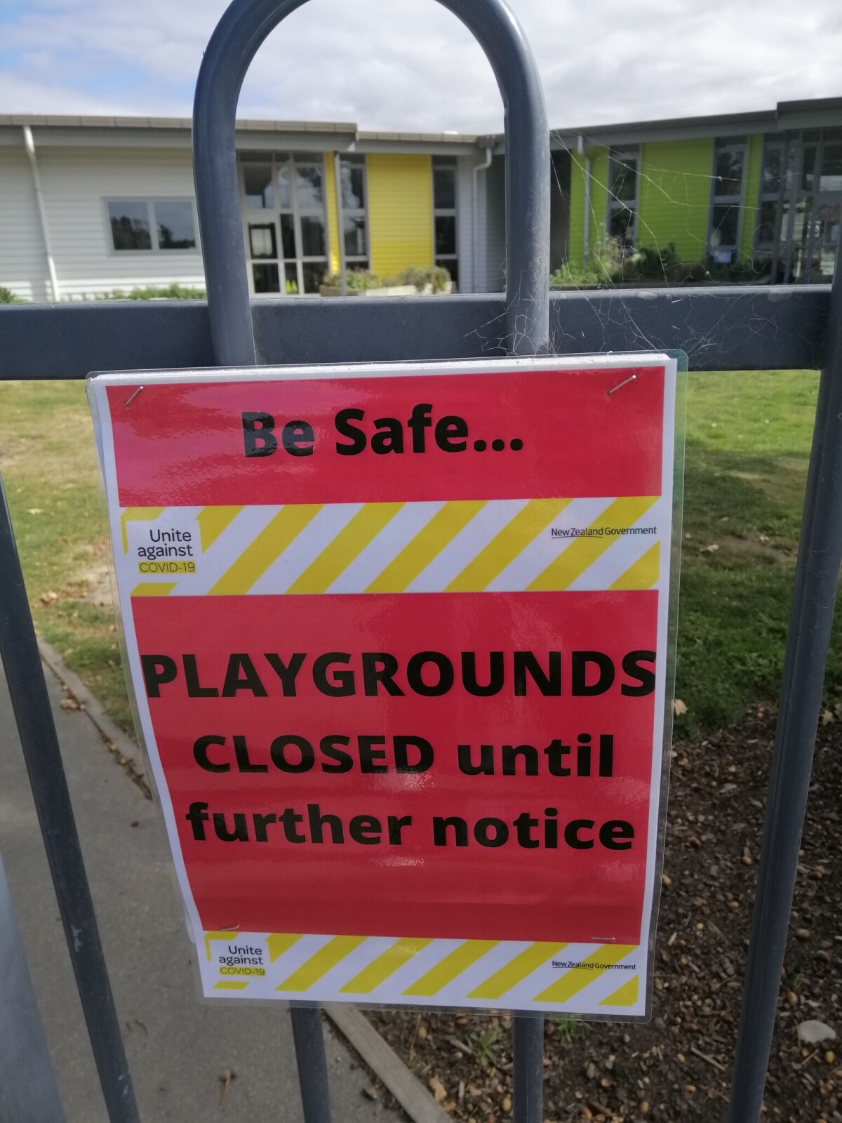 Unite against COVID-19 sign on the gate at Halswell School - "Be Safe...PLAYGROUNDS CLOSED until further notice".