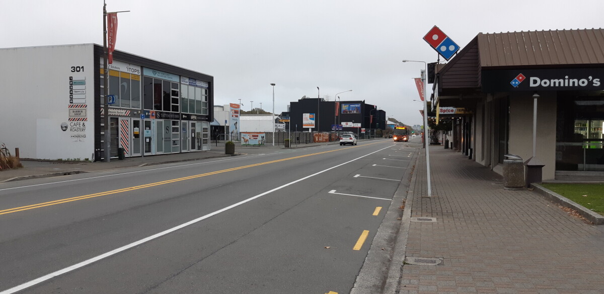 An orange line bus to Halswell travelling along Lincoln Road, one of the few bus services for essential travel during the COVID-19 lockdown. Taken near the entrance to the Addington Town shops facing Dominos Pizza at 300 Lincoln Road during a morning walk at 8.30am.
