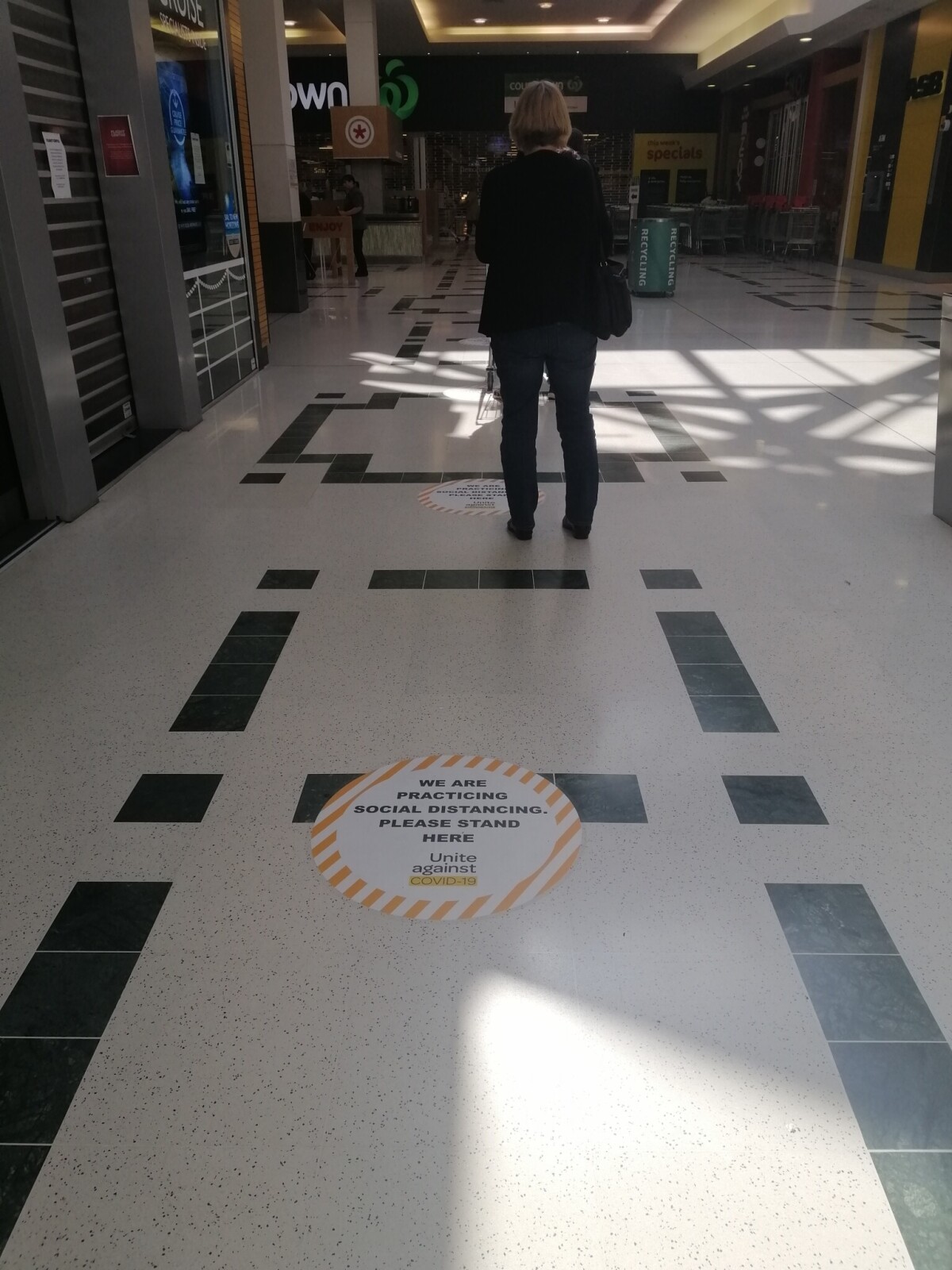 A photo showing the procedure for waiting in line with social distancing during the Covid-19, coronavirus pandemic. Circular stickers were placed on the ground indicating where to stand to keep the appropriate distance from the person in line in front of you and read: "We are practicing social distancing. Please stand here. Unite against Covid-19."