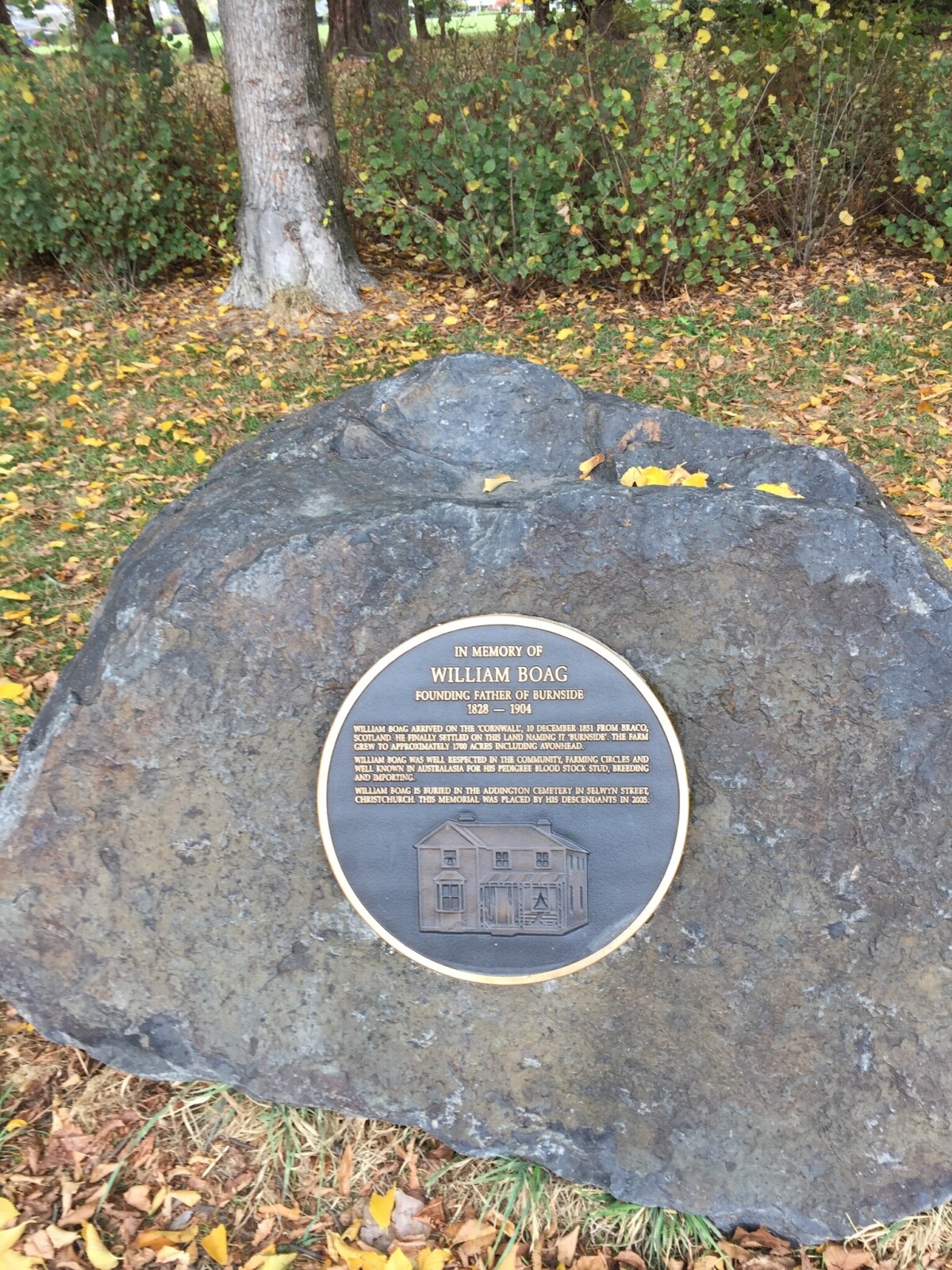 Plaque commemorating the arrival of Mr. William Boag the "Father of Burnside".