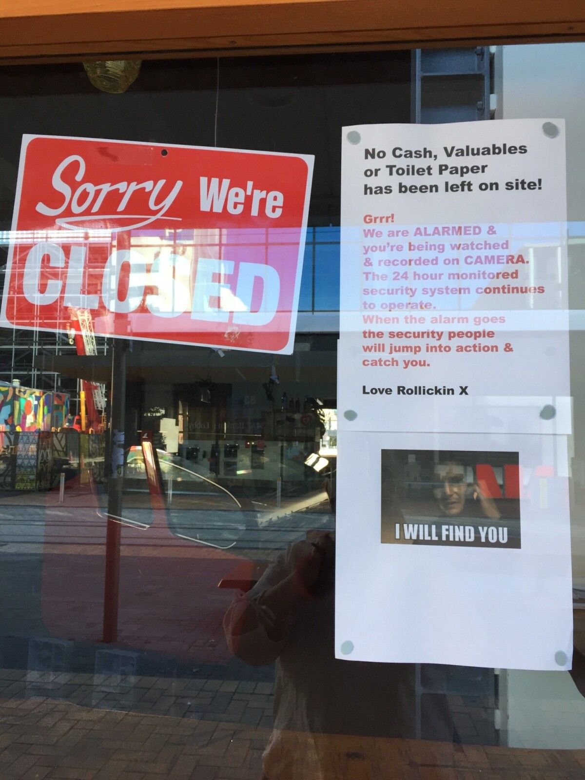 Signs displayed in the window of Rollickin Gelato, Cashel Street.