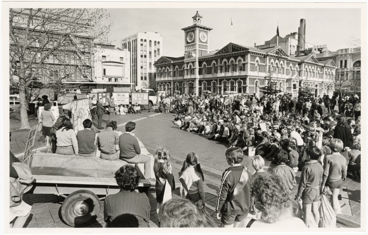Children in Cathedral Square for a presentation on ecology led by the Mayor Sir Hamish Hay.