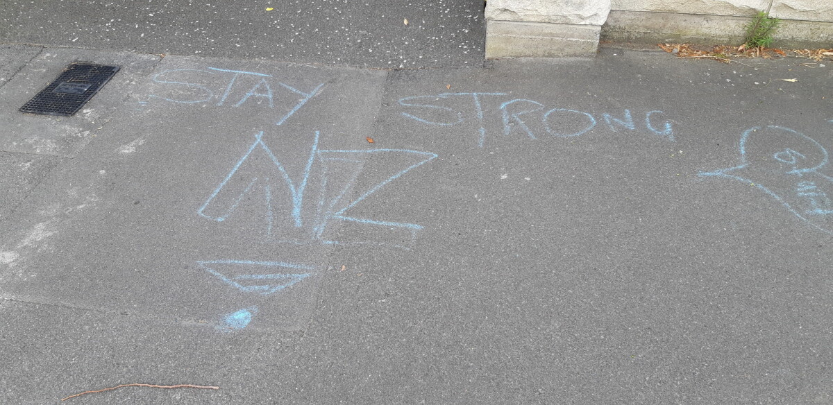 A message of 'Stay Strong NZ' written on the pavement outside The Yoga Place at 147 Barrington Street in Somerfield. The message is for those out for their local daily walk during the COVID-19 lockdown.