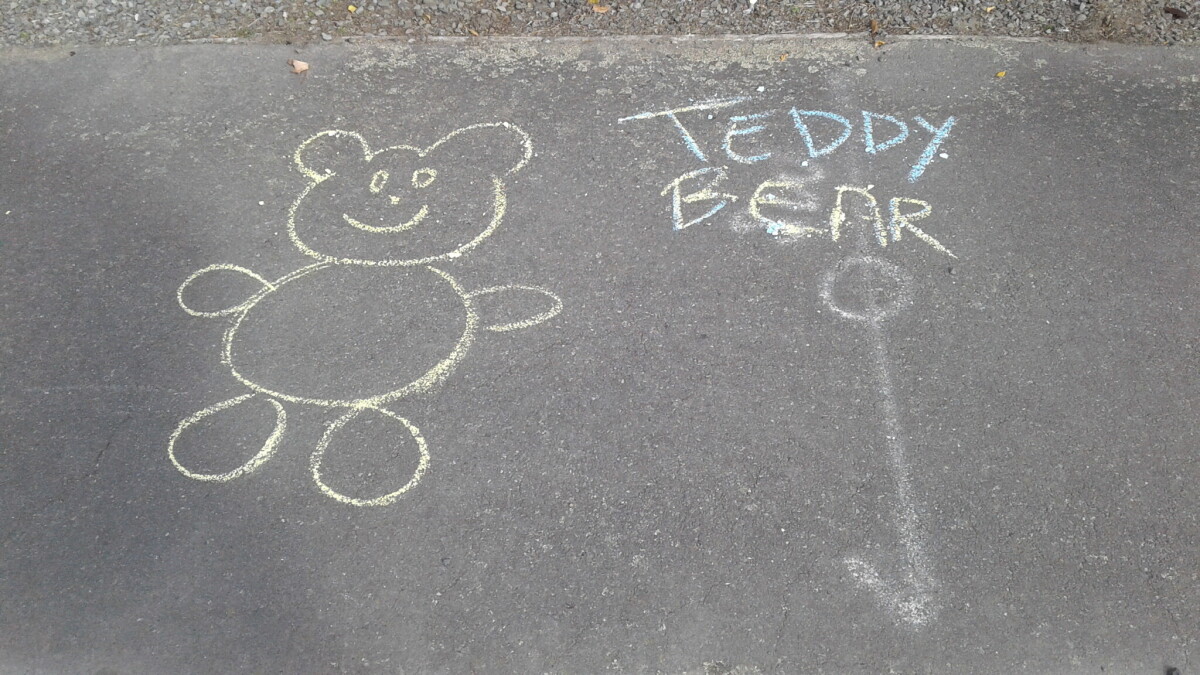 Chalk teddy bear on footpath, for the lockdown bear hunt.
