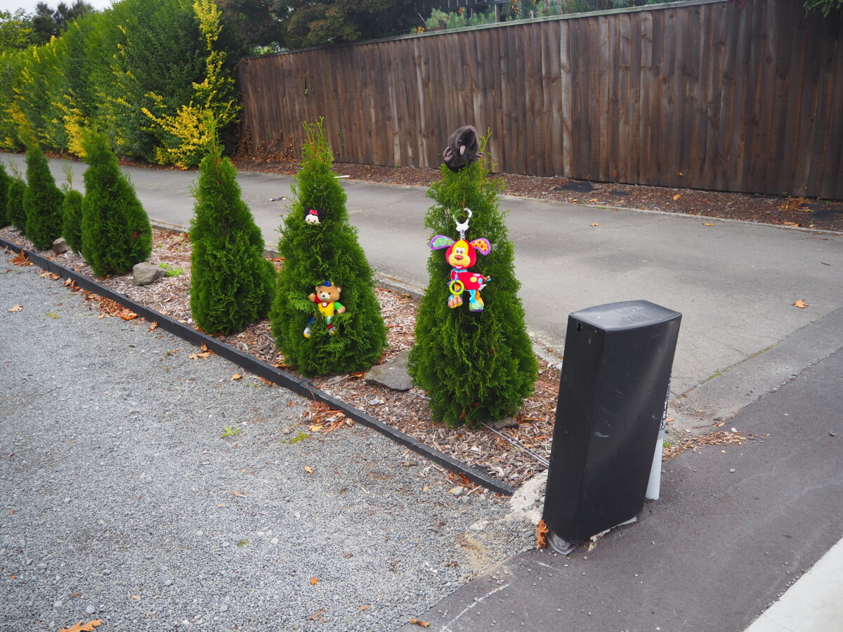 Soft toys including a bear, dog and kiwi decorating trees at the end of a driveway along Wairakei Road.
