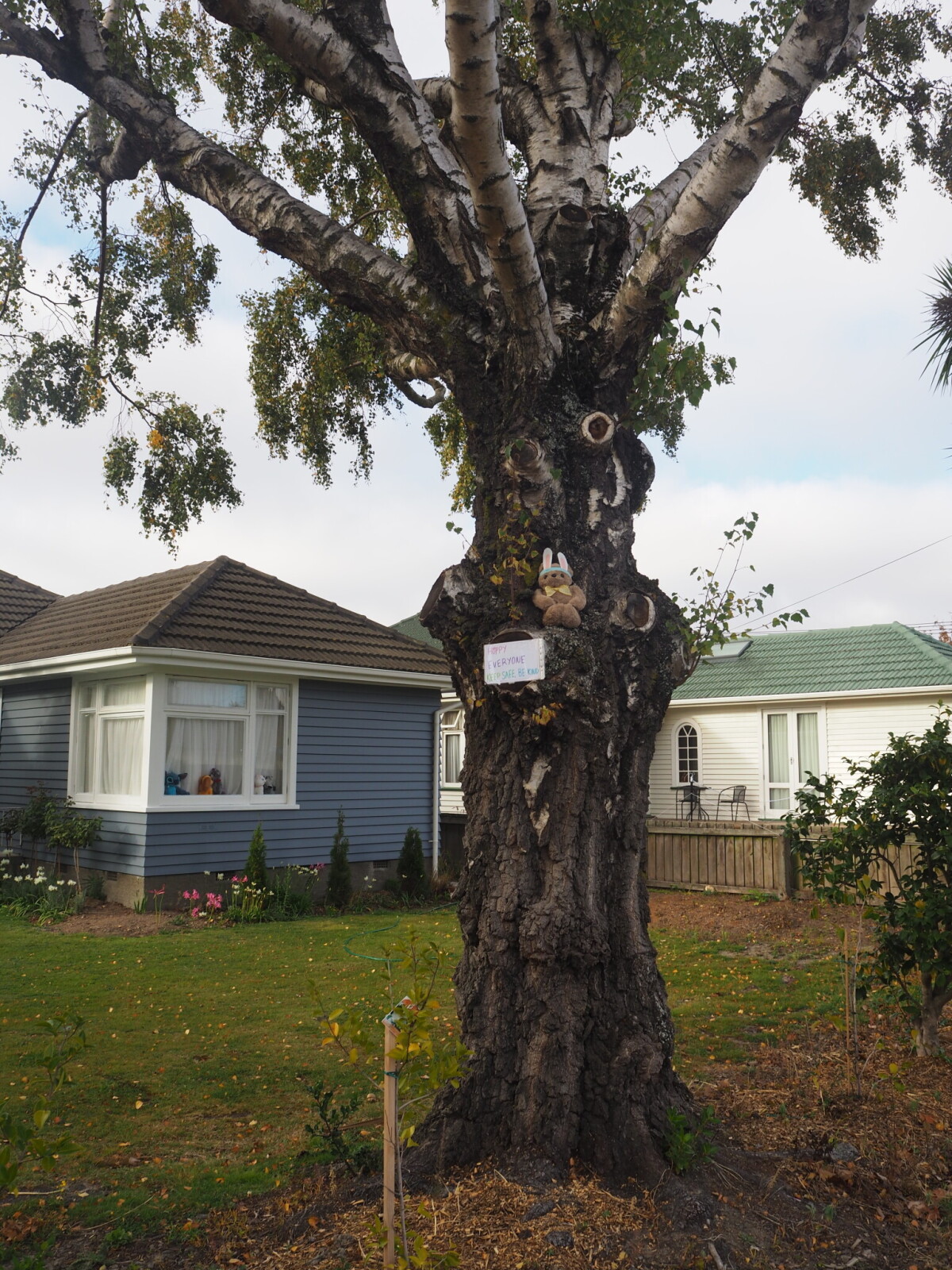 Bear in tree along Harris Crescent for the Lockdown Bear Hunt dressed up with Rabbit ears for Easter.