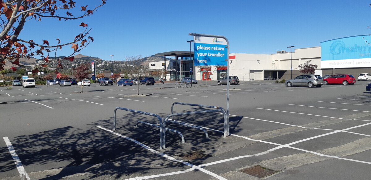 View across the mostly empty carpark at Barrington Mall on the corner of Athelstan Street and Simeon Street in Spreydon. Taken during an afternoon walk during the COVID-19 lockdown when supermarkets were one of the few facilities to be open.
