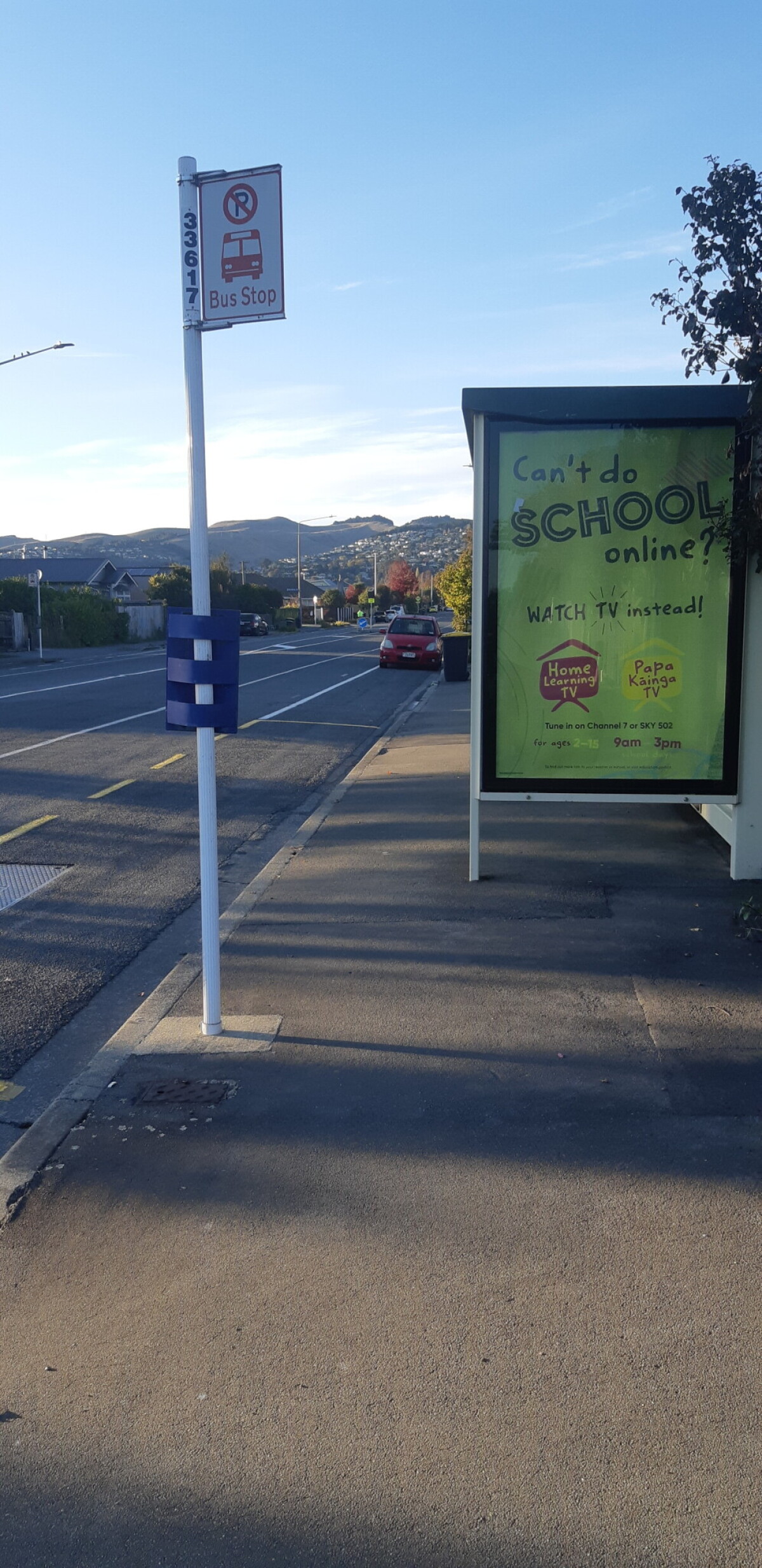 A poster at a bus stop on Lyttelton Street in Spreydon advertising Home Learning TV for children to access whilst distance learning during the COVID-19 lockdown.