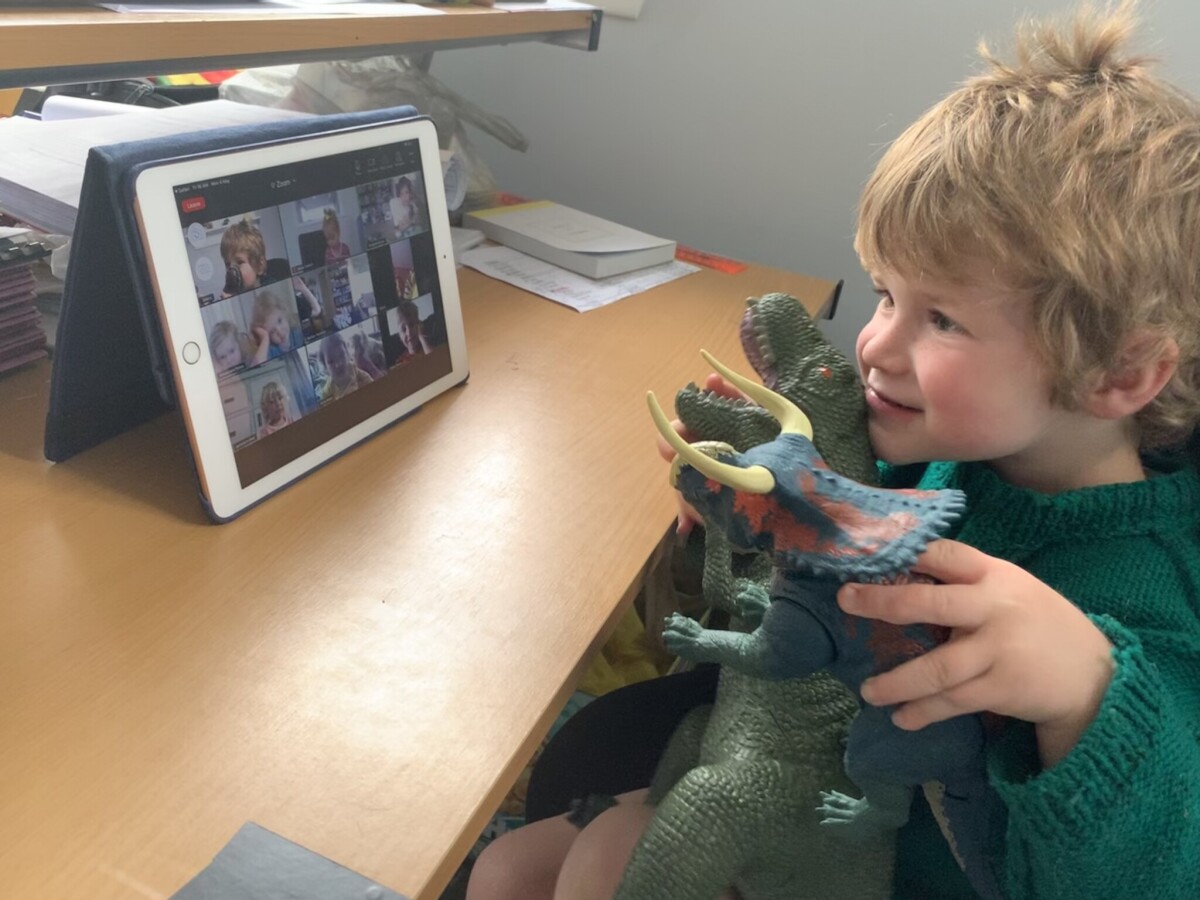 Julius Ward having a Zoom meeting with his teachers and friends from St Albans Community Preschool during lockdown.