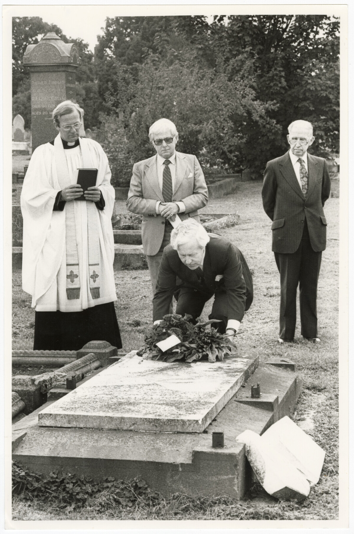 Mayor of Christchurch Sir Hamish Hay (centre) laying a wreath on the grave of early Christchurch architect William Armson at the Barbadoes Street Cemetery on the centenary on his death. Looking on are, from left, Vicar of St Luke's Reverend Simon Acland, chairman of the Historic Places Trust Don Donnithorne and Christchurch historian W.J.A. Brittenden.