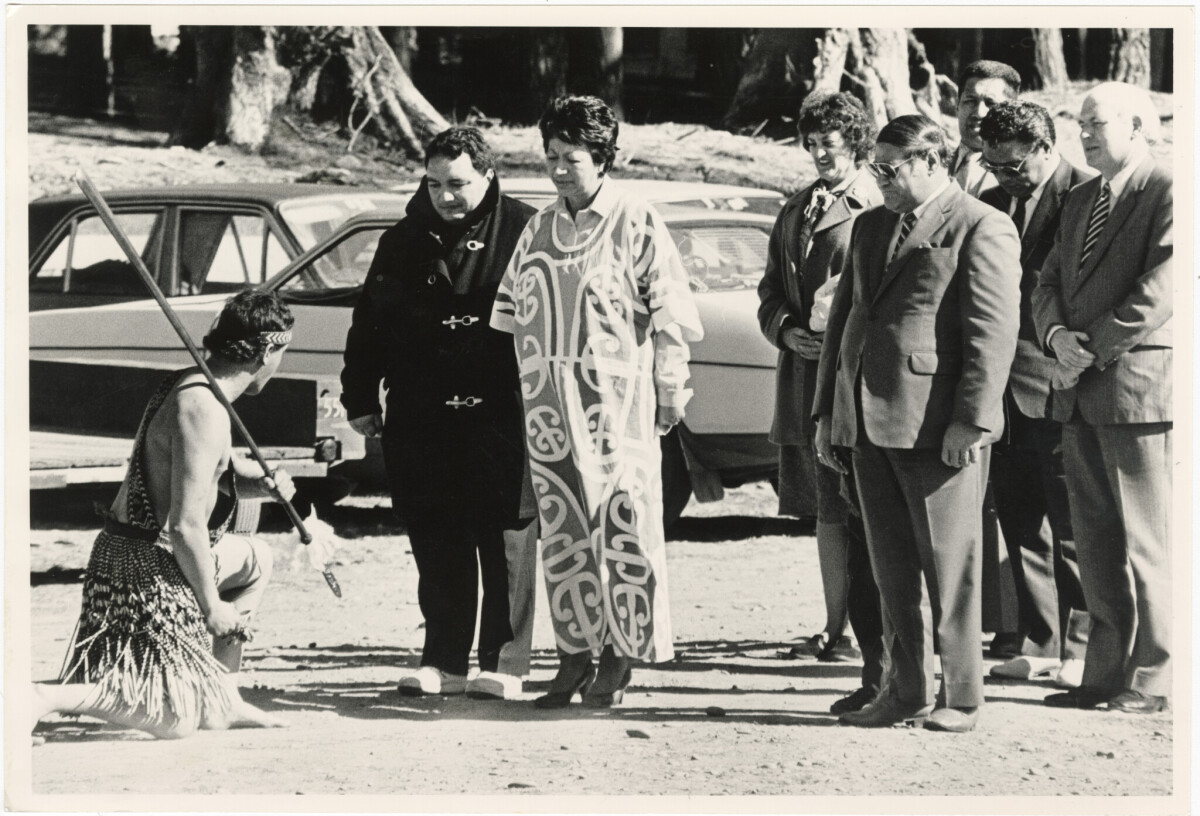 Whetu Tirikatene-Sullivan, the MP for Southern Maori, and Minister of Maori Affairs, Koro Wētere, being welcomed on to Nga Hau E Wha National Marae by Te Ari Brennan. Celebrating the official opening of the Access unemployment training scheme.