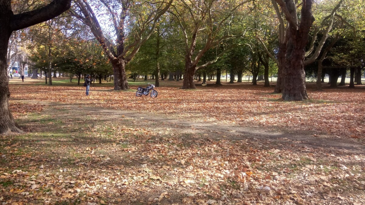 A man taking a carefully staged photograph of his motorcycle in South Hagley Park on an autumn afternoon during a walk into central Christchurch. Taken shortly after New Zealand moved into COVID-19 Alert Level 3 which meant walking further afield was permitted.