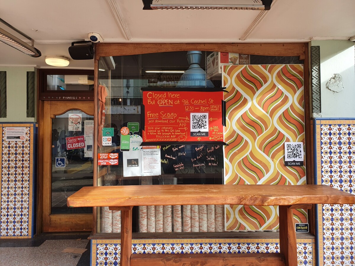 During Level 3, restaurants and cafes could serve customers via Click and Collect or Delivery. Here Rollickin Gelato advertises the hours of their (recently built) Cashel St cafe and the app that they use for online ordering.