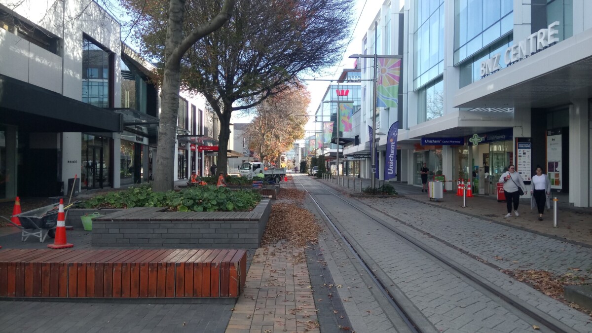 Cashel Street looking west toward the Bridge of Remembrance