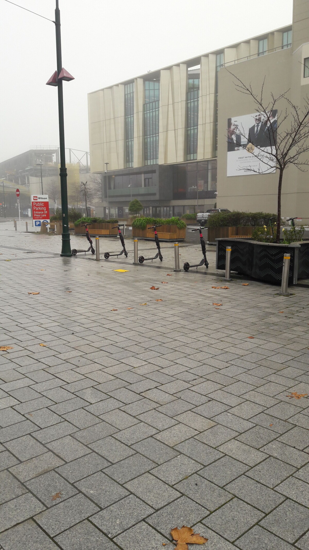 The Flamingo scooters return to the city on the morning of the first day of Level 2 after several weeks of lockdown, appropriately spaced out in front of Tūranga.