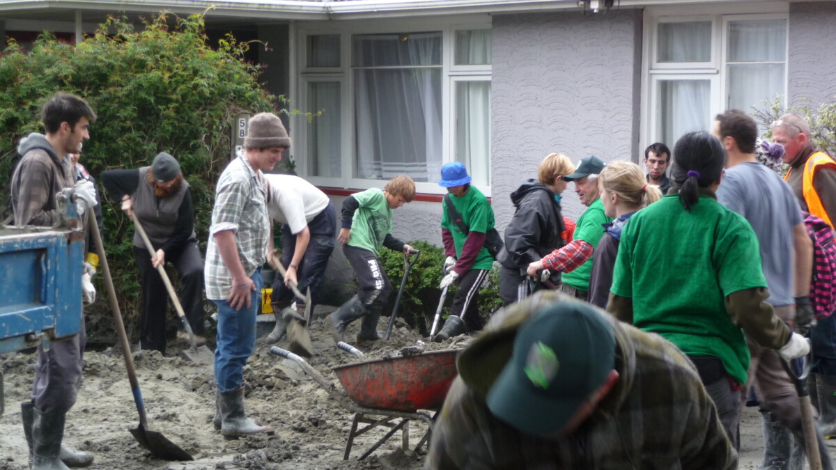 University of Canterbury students united with farmers and rural contractors to help Avonside residents dig their way out of liquefaction silt yet again, following 13 June 2011 earthquake. Here the team are tackling the latest half-metre-deep layer of silt surrounding my flat at 58A Keller Street. Their assistance was extremely welcome, as we were pretty exhausted by that stage (& in my case, still had nerve injuries in my elbows following all-day liquefaction digging & hauling efforts back in February).