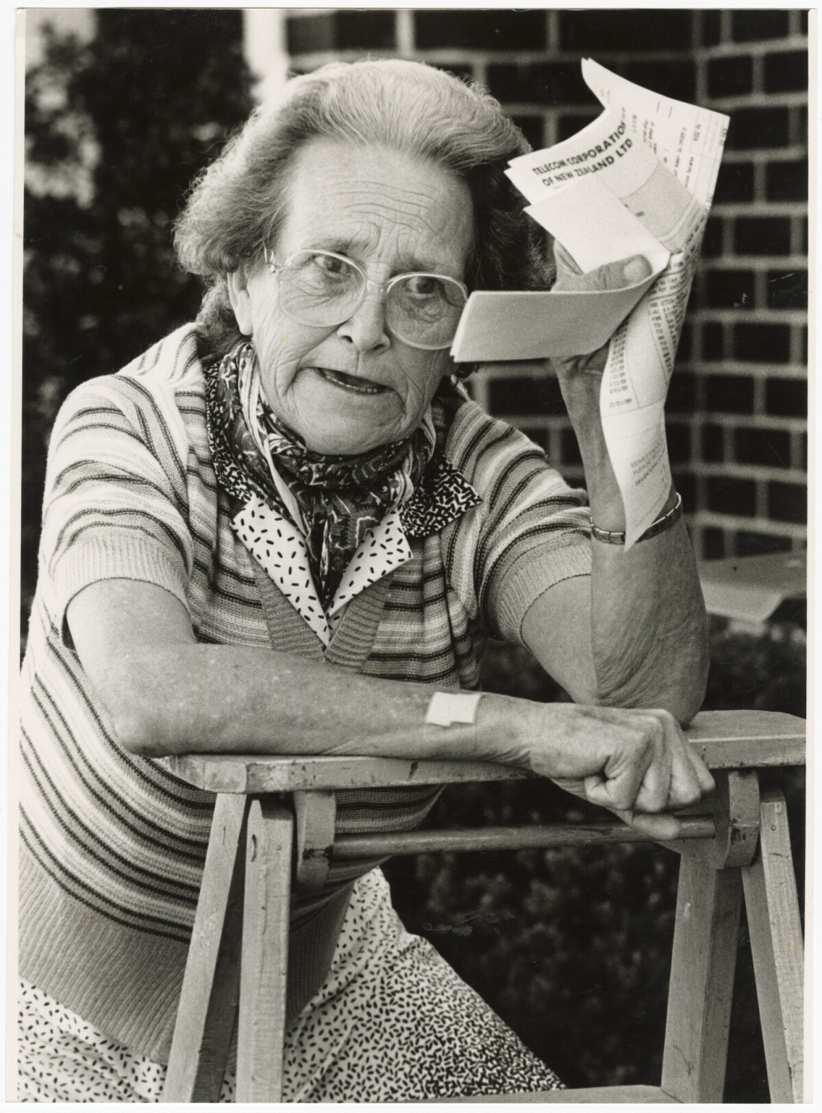 Ethel Sotheran with her stepladder ahead of staging a protest in Cathedral Square against the cost of power and telephone bills.