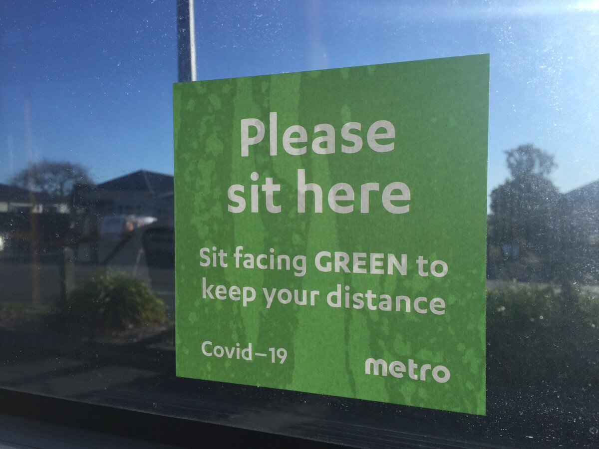 Window sticker used to help bus users know where to sit. It reads "Please sit here / Sit facing GREEN to keep your distance / Covid-19 / metro".