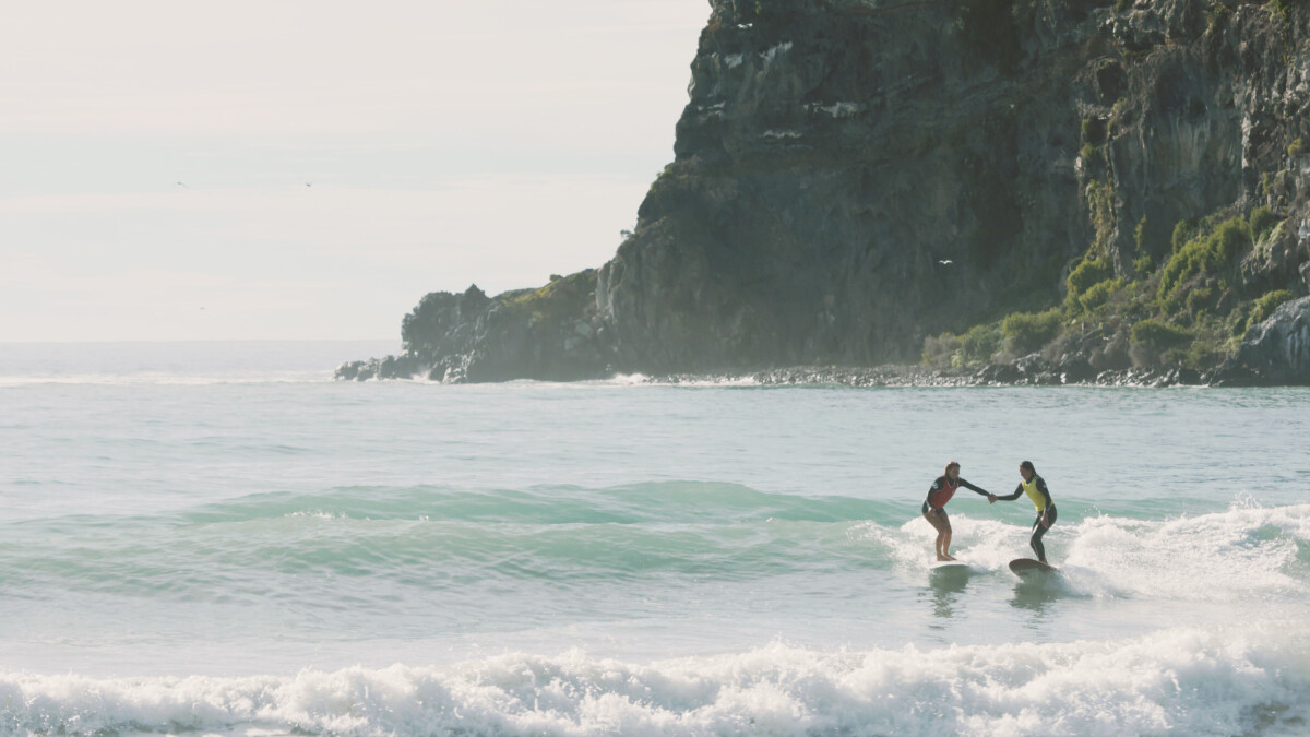 Two friends surf together at the Single Fin Mingle Competition in Sumner.