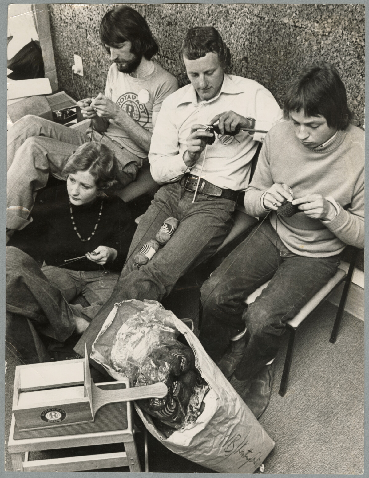 Members of the Christchurch Rotoract Club participating in a knitathon in a New Brighton wool shop to raise money for the Himalayan Trust Hospital in Nepal. Pictured are, from left, Vicki Bowater, Bruce Whitnall, Dennis Stollery and Lawrence Smith