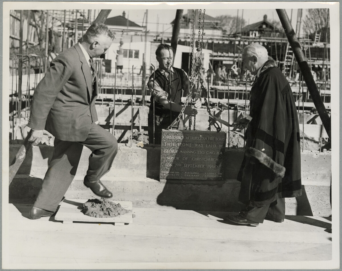 Mayor, George Manning, participating in the laying of the foundation stone for the new Central Fire Station at 200 Kilmore Street. With him is the contractor C. S. Luney (left) and project foreman C. H. Gilbertson.