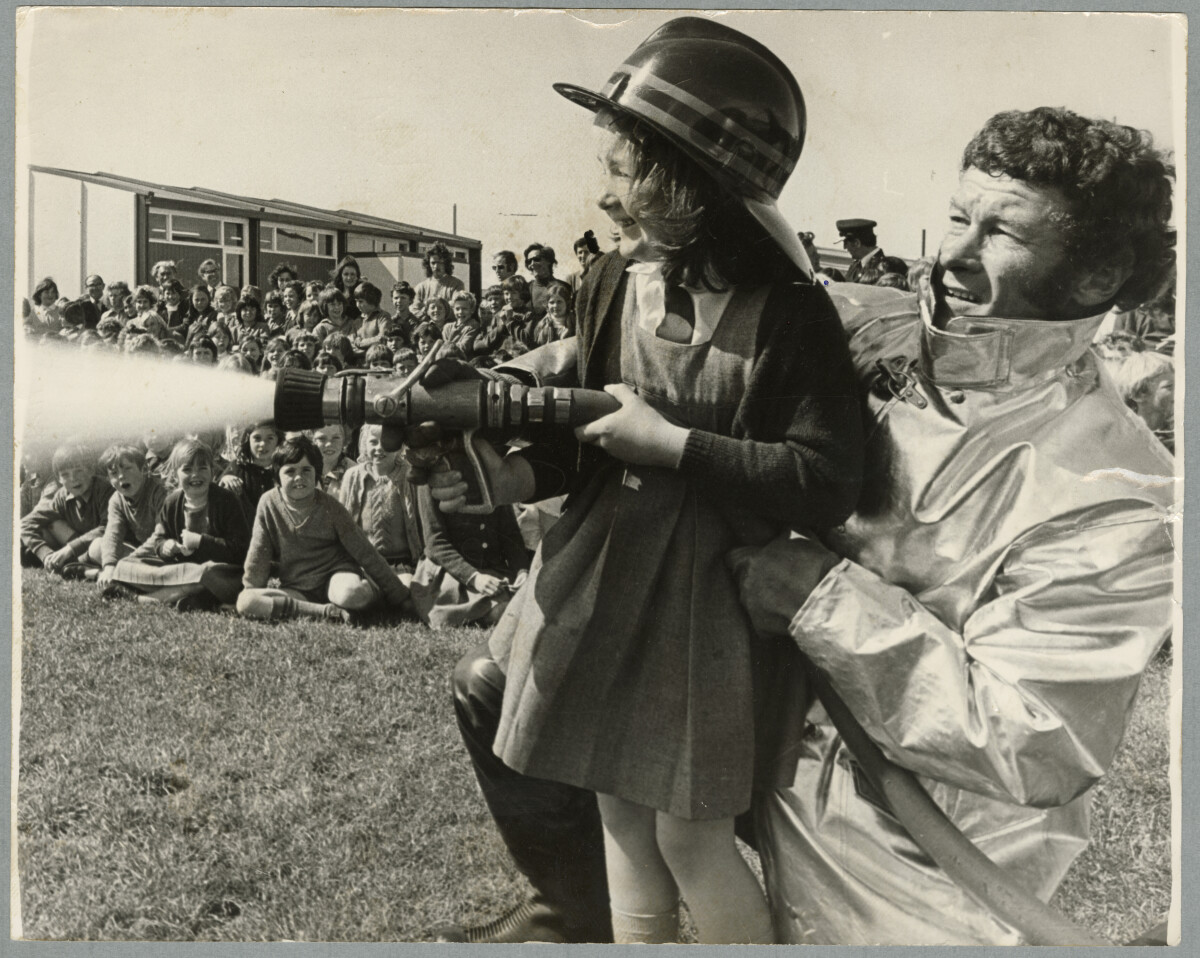 Firefighter, S. McNair, helps Nichola Phillips use a firehose at a demonstation at Isleworth Primary School in Bishopdale for Fire Prevention Week.