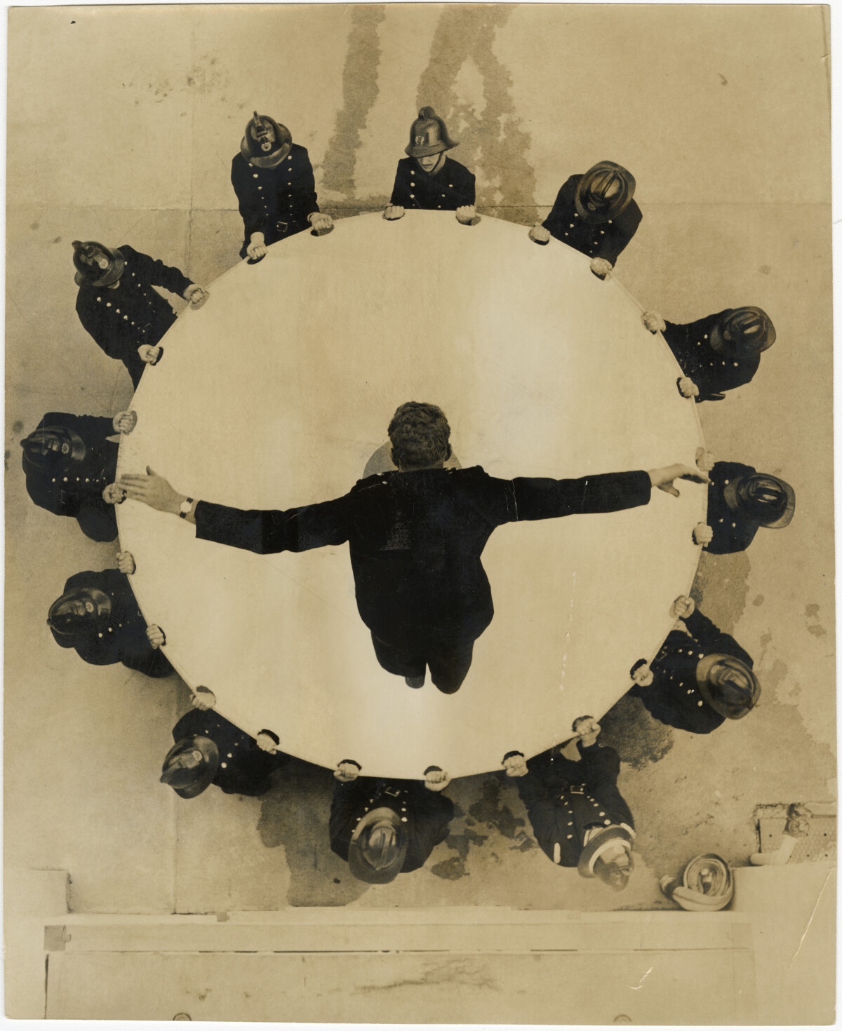 A firefighter jumping into a jumping sheet as part of a drill at the Central Fire Station at 200 Kilmore Street.