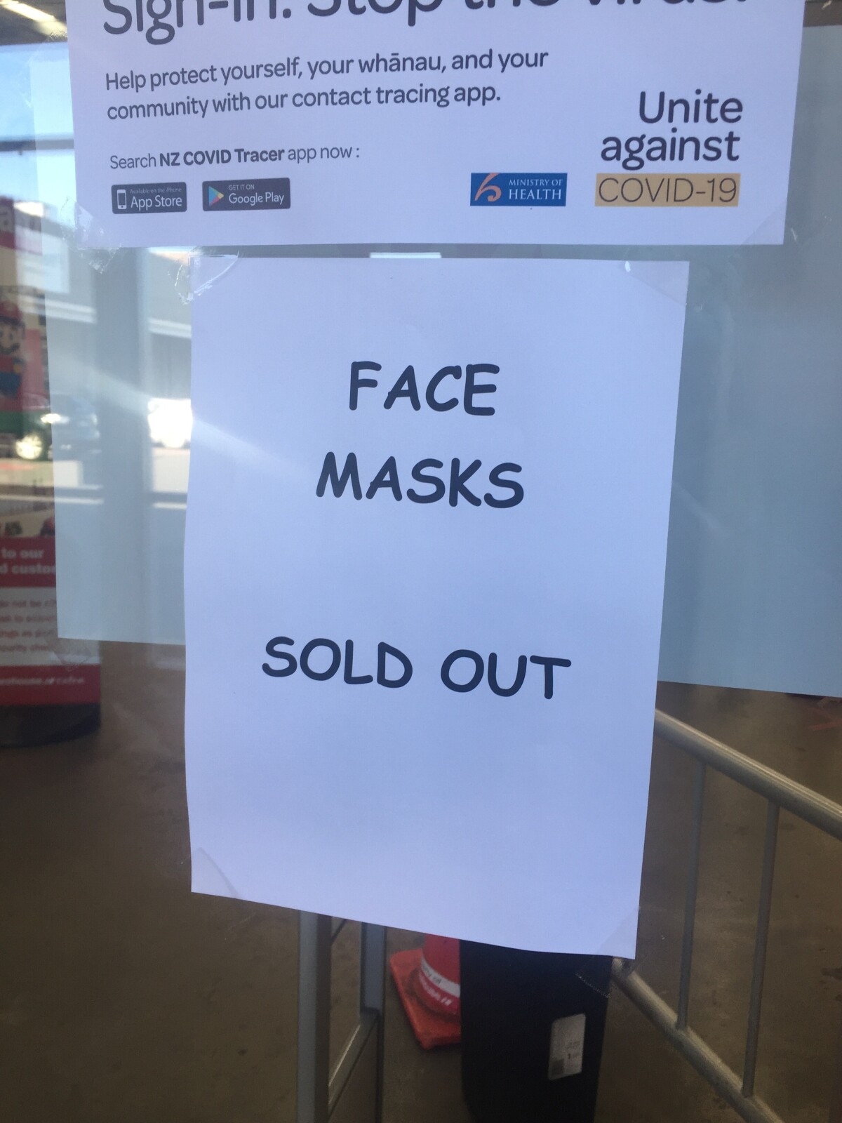 A4 paper sign at store entrance informing customers that there are no face masks available to purchase. During Alert level 2.