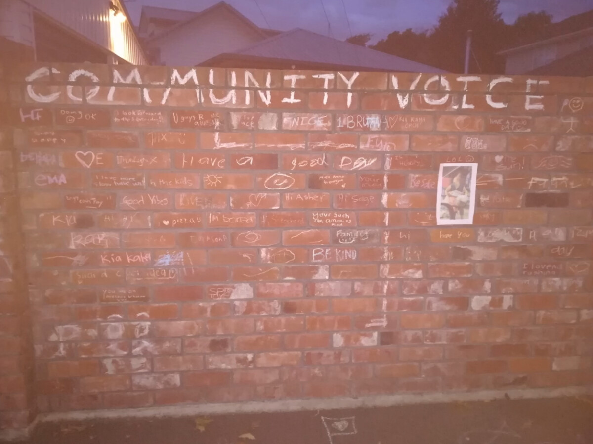 "An Avonhead neighbour used her brick fence to let the community write messages during lockdown." - Contributor's note