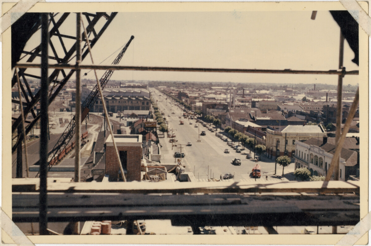 View looking west from the clock face circle of the Christchurch Railway Station tower during construction, looking along Moorhouse Avenue.