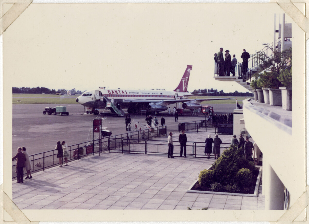 The first commercial flight, Boeing 707, arriving at Christchurch Airport, a Qantas flight from Queensland and the Northern Territories.