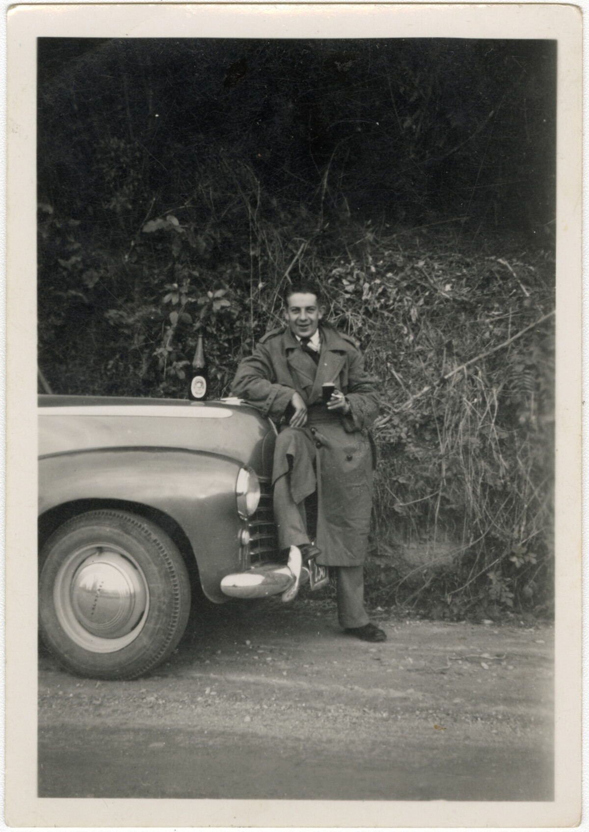 Trevor Beecroft taking a break with a drink and smoking next to his car.