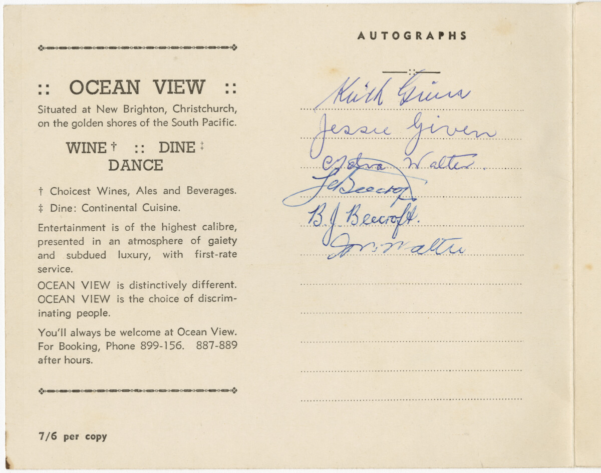 Inside cover of a promotional photograph taken for diners at the Ocean View Restaurant in New Brighton. Includes details of the restaurant and autographs of the diners featured in the associated photograph. Autographs include those of Keith Guin, Jessie Given, Mr and Mrs Walter and Trevor Beecroft and Betty Beecroft.