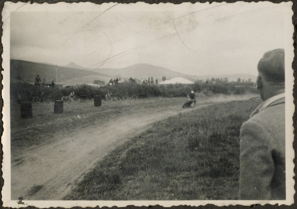 View of a motorcycle racing on a dirt track at Ruapuna Speedway.