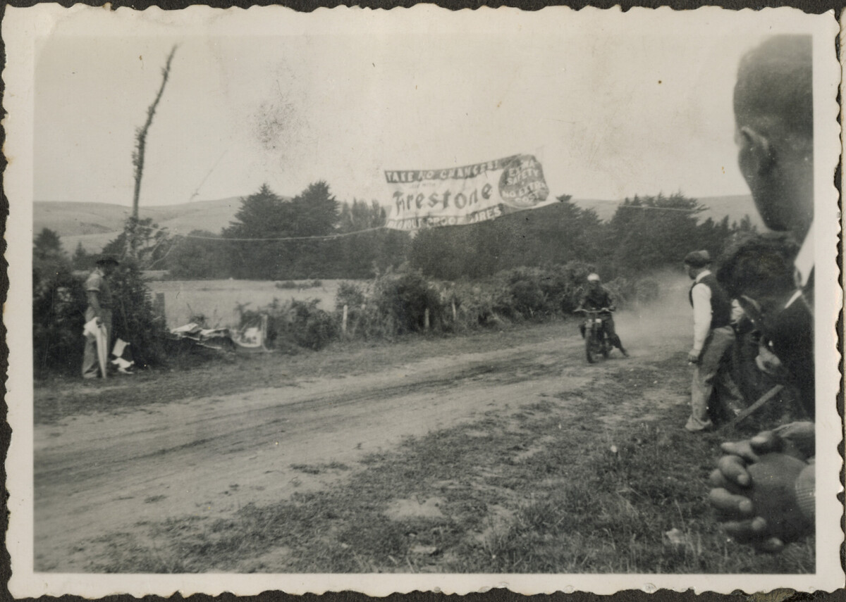 Taken from the side of the track at Ruapuna Speedway during a motorcycle race. A firestone tyre advertisement is hanging across the track.