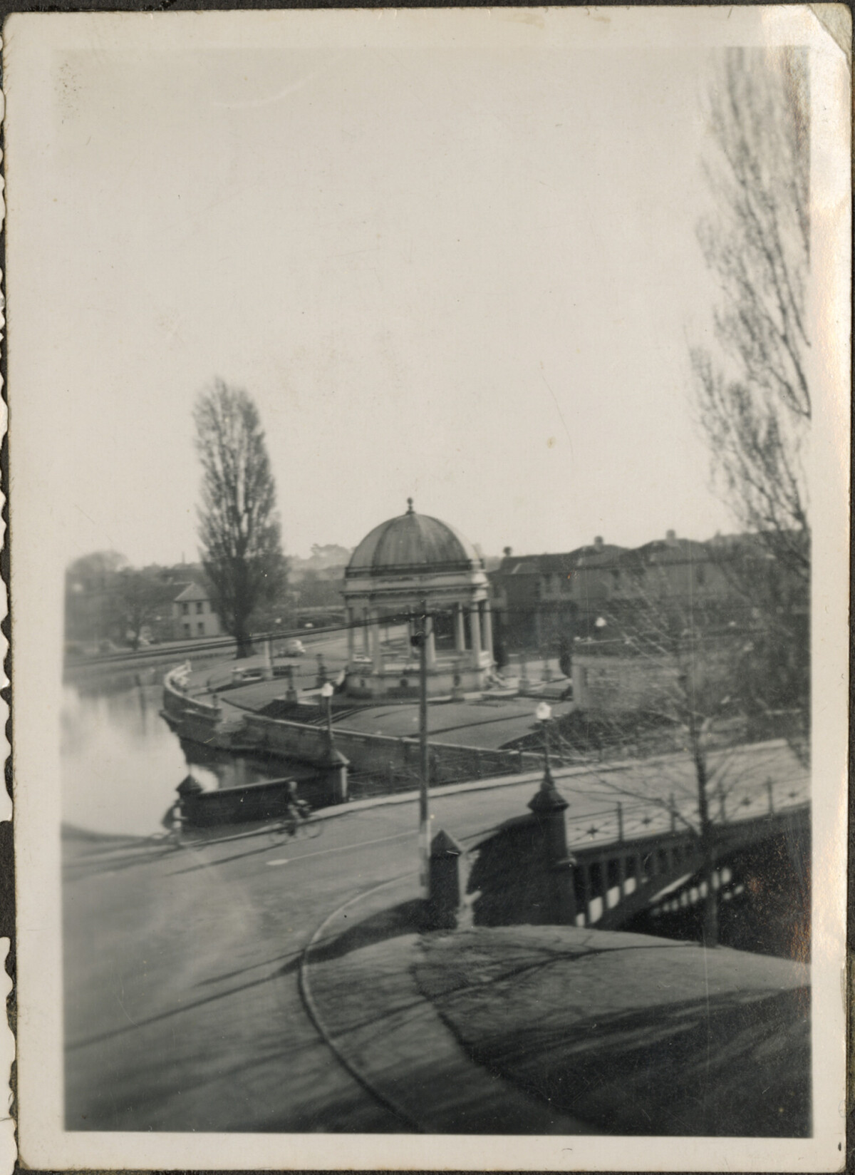 View of the Manchester Street bridge looking toward the Thomas Edmonds Band Rotunda. Taken from Oxford Terrace, possibly from the Trade Service Ltd building at 250 Oxford Terrace.