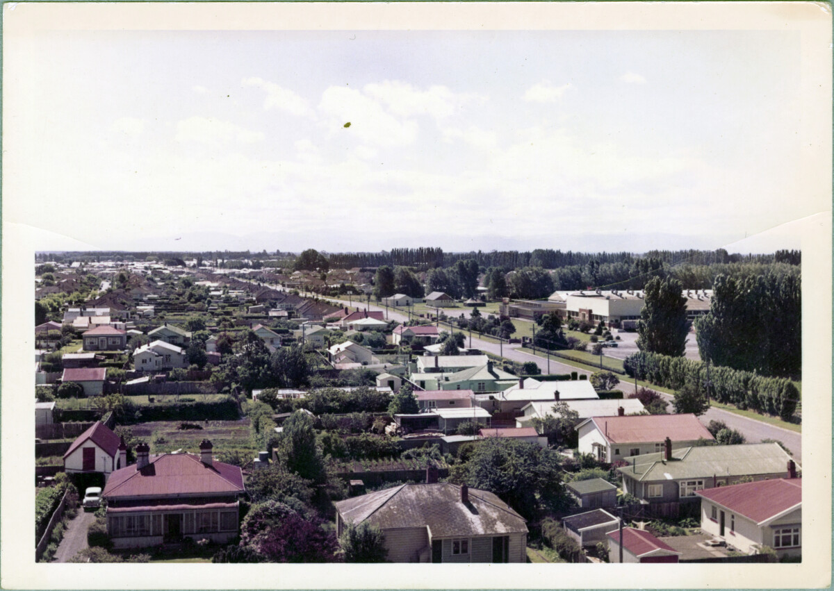 View of the Firestone Tyre & Rubber Company factory at 84 Langdons Road in Papanui. Taken from the Sanitarium Health Food Co. building at 54 Harewood Road.