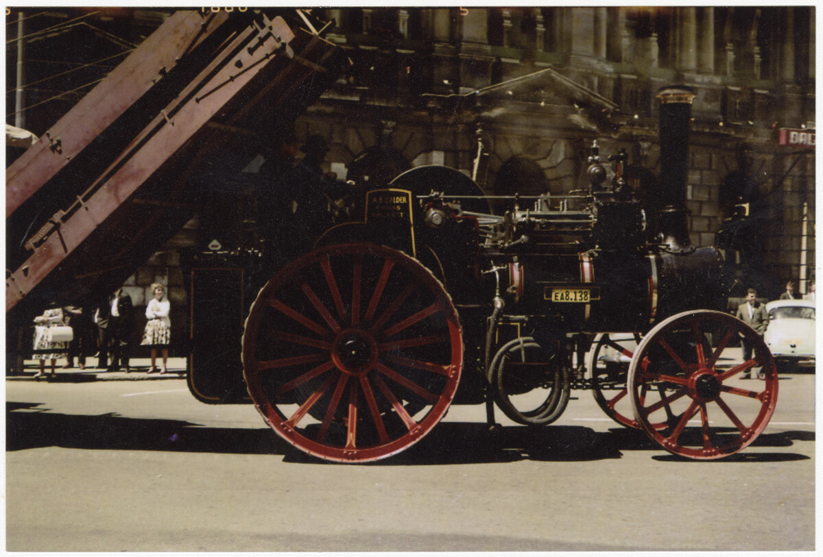 A traction engine travelling through Cathedral Square during the Canterbury A&P Centennial.