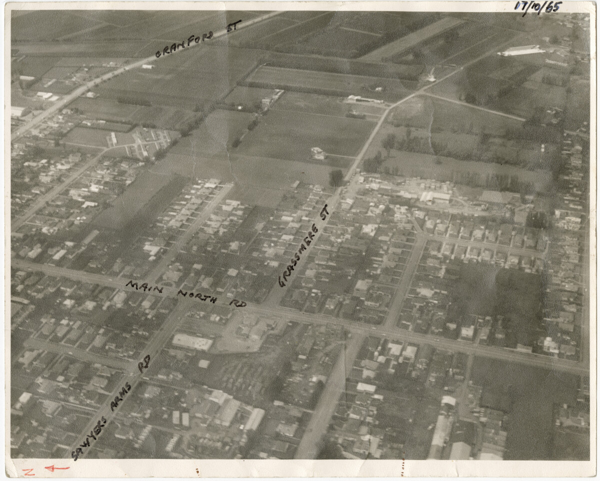 Aerial view of Sawyers Arms Road, Main North Road, Grassmere Street and Cranford Street in Papanui.